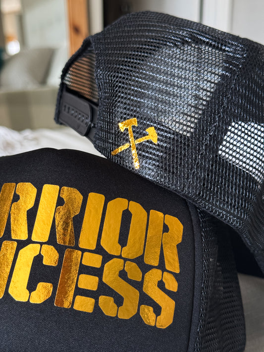 WARRIOR PRINCESS GOLD FOIL TRUCKER HAT IN BLACK